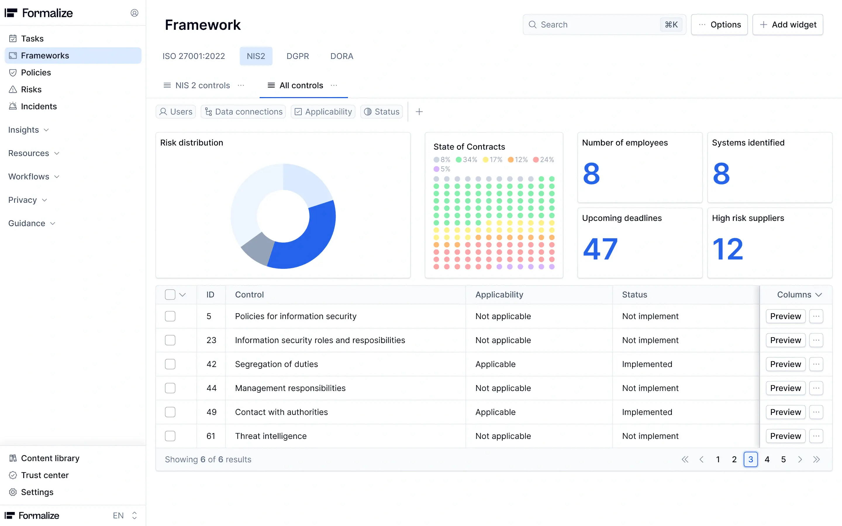 Track and manage implementation of NIS 2, DORA, ISO 27001, and more with ease and efficiency.