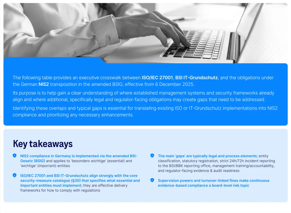 Una visión práctica que destaca la correlación de ISO/IEC 27001 y BSI IT-Grundschutz con los requisitos de NIS2, identificando las brechas de cumplimiento habituales.
